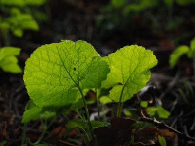 Young and old garlic mustard plants are quite different-looking. Leaves of young, first-year plants grow in low rosettes and are kidney or heart-shaped, with scalloped edges.